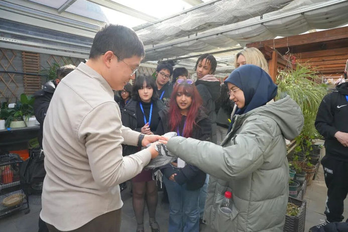 In the school greenhouse, teacher Mr. Rui introduced the innovative shell-free chick incubation experiment, displayed student-made biological specimens, and showed the visitors young fruit and vegetable seedlings as well as a rescued injured pigeon, demonstrating students’ respect for life and nature.